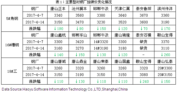 成都鋼鐵網(wǎng)資訊4月14日消息: 本周焦點(diǎn):雖然整個型市場還是弱勢為主,不過由于價格快速下跌后,部分低位資源出貨有一定增加,主流華北市場廠家有一定的拉漲意愿,對于行情的向好有提振作用。預(yù)計(jì)短期內(nèi)可能會出現(xiàn)一波超跌反彈的走勢,但是至于能不能真正扭轉(zhuǎn)行情趨勢,還是要看終端需求的復(fù)蘇情況。綜合預(yù)計(jì)下,下周型材市場可能是以先小幅反彈后偏弱調(diào)整的態(tài)勢運(yùn)行。 【內(nèi)容提要】 ◆本周型鋼市場:弱勢主導(dǎo),下行不止 ◆唐山型材軋線開工率回升 ◆市場庫存增加 ◆型廠理論盈利空間大幅收窄 ◆預(yù)計(jì)下周型市仍是偏弱 一、市場行情回顧
