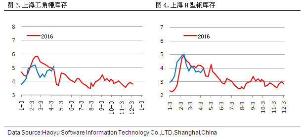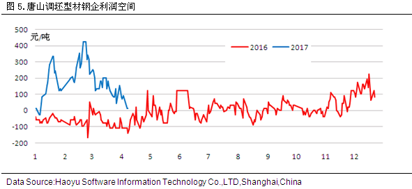 據(jù)2017年4月14日對上海市場型材倉庫進(jìn)行的同口徑調(diào)查統(tǒng)計(jì)顯示,工角槽庫存5.12萬噸,較上周增加0.36萬噸,H型鋼庫存3.93萬噸,較上周增加0.27萬噸。 四、鋼廠盈利空間分析