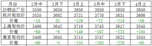 4月上旬鋼價震蕩走低,整體跌幅約120-150之間,雖月初資金及其他方面壓力有所釋放,然受鋼坯及期貨走勢大跌影響,商家對后市預(yù)期謹(jǐn)慎,仍多積極讓價出貨,部分資源高低價差接近半百。截至目前為止,杭州地區(qū)庫提價格約3530左右,而上海廠提價格約為3480,南京廠提基價約3500左右,旬內(nèi)江浙滬主導(dǎo)城市沙鋼均價大約在3545元/噸左右,而沙鋼上旬指導(dǎo)價為3650元/噸,倒掛幅度相比上旬有所減緩,旬內(nèi)具體價格走勢詳情如下圖所示。