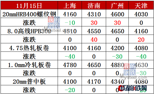 11月15日,全國(guó)鋼材市場(chǎng)價(jià)格震蕩偏弱。濟(jì)南、廣州、北京、烏魯木齊等7個(gè)城市20mm螺紋鋼價(jià)格上漲10-50元/噸,杭州、福州、南昌等3個(gè)城市螺紋鋼價(jià)格下跌20元/噸。4.75熱軋板卷市場(chǎng)價(jià)格小幅下跌。上海、杭州、合肥、廣州、武漢、京津、沈陽(yáng)、成都等15個(gè)市場(chǎng)價(jià)格下跌10—50元。20mm中厚板市場(chǎng)價(jià)格窄幅偏弱。上海、杭州、南昌、天津、太原、重慶等7個(gè)市場(chǎng)價(jià)格下跌10—20元;北京、哈爾濱、武安市場(chǎng)價(jià)格上漲10—40元。