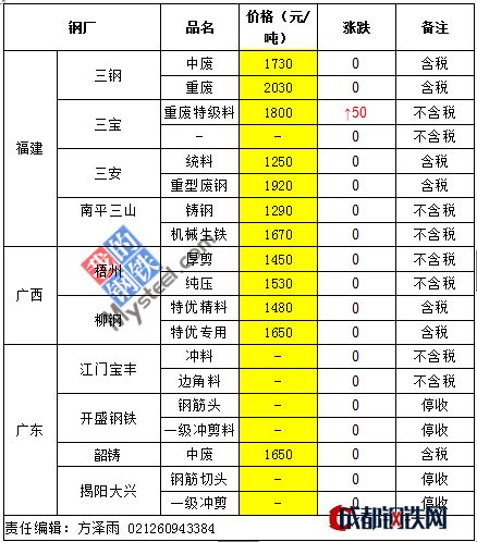 22日福建廢鋼市場個(gè)別調(diào)整,現(xiàn)市場重廢1700-1730不含稅,三鋼2030三安1950含稅,三寶1750吳航1820不含稅;17日華南廢鋼整體暫穩(wěn),鋼筋壓塊1650-1700重廢1660-1710,中廢1450-1500矽鋼片1700-1750不含稅。