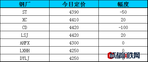 12月27日杭州市場(chǎng)7家廠庫(kù)前移鋼廠螺紋鋼銷售指導(dǎo)價(jià):CD 4420元/噸較上一交易日下調(diào)100元/噸;ST 4390元/噸較上一交易日下調(diào)50元/噸;AHFX 4300元/噸、LXHH 4250元/噸、DYLJ 4250元/噸價(jià)格持穩(wěn);XC 4410元/噸、LSJ 4420元/噸較上一交易日上調(diào)20元/噸。